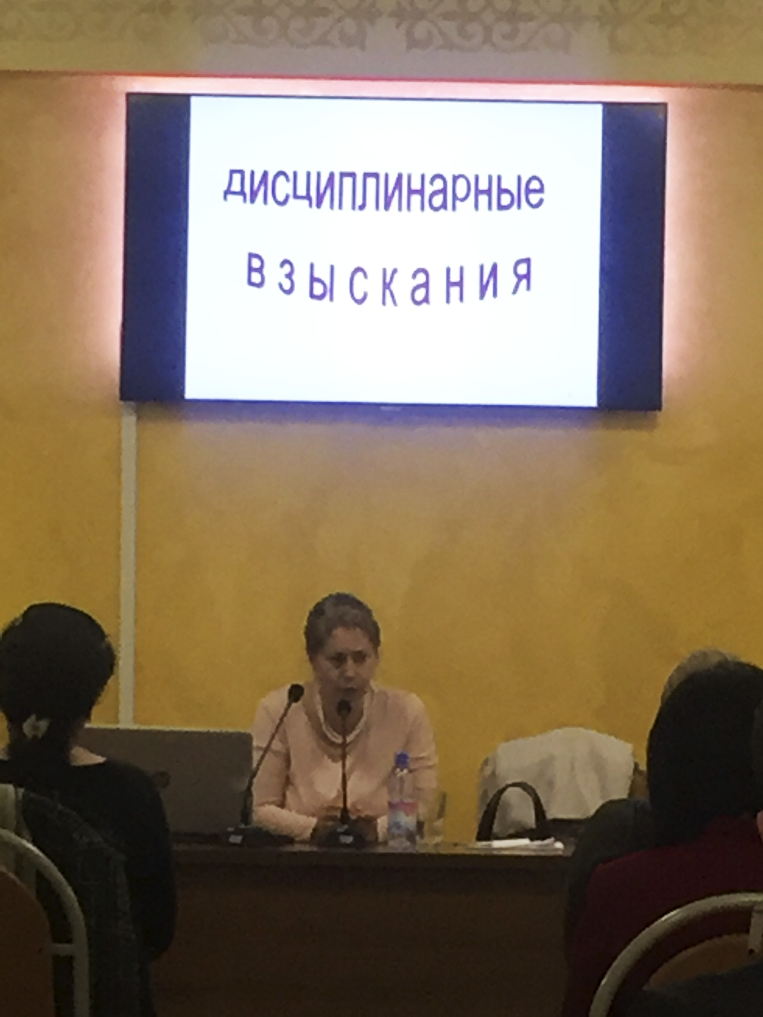 По данной теме были рассмотрены статьи Трудового Кодекса Республики Казахстан: «Порядок применения дисциплинарных взысканий» и «Сроки наложения и действия дисциплинарного взыскания». В ходе проведения семинара Гилева Н.В. ознакомила участников с изменениями, внесенными в Трудовой Кодекс Республики Казахстан в 2018 году